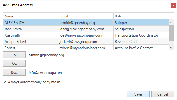 Access to the Add Email Address dialog is by clicking on one of the recipient buttons (To, Cc, Bcc) from the MoversSuite Email form. This dialog allows you to update the recipients of an email. It provides a list of all personnel linked to the order with valid email addresses that you can select from quickly.