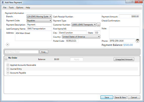 Accessed through the Add button on the Detail Processing tab, this screen allows you to create a detail payment line or cash receipt entry. Please refer to the Add New Payment section under the field descriptions for Payment Application for more information.