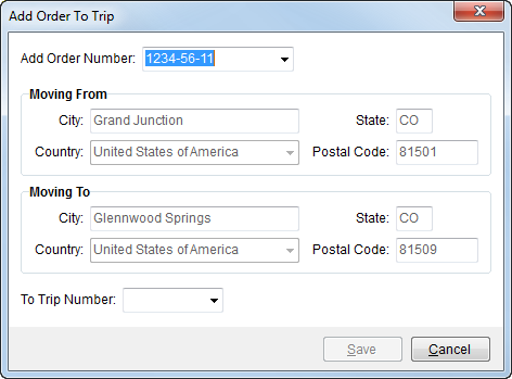 Save (Alt+S) Pressing Save will add the selected Order Number to the specified trip and close the dialog. |