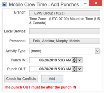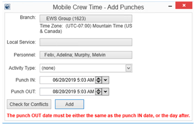 Use the Punch IN and Punch OUT scrollers to enter exact Punch In and Punch Out times. Use the ”Check for Conflicts” button to be sure that the Mobile Crew Time for a person assigned to a Local Service, is not being overlapped with any other service.