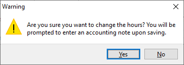 You can update the default Hours Worked by entering new data within this setting. If you update the Hours, you will receive a confirmation prompt and will be required to enter an Accounting Note.
