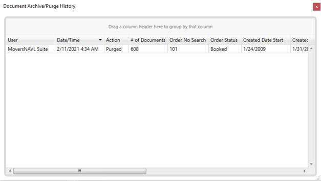 The View History button opens the Document Archive/Purge History screen showing you the details of all recent archives and purges.