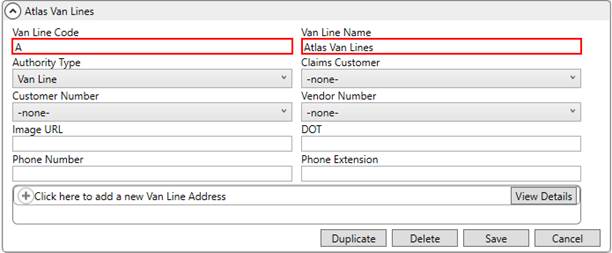 Establish a Van Line Setup record for Atlas Van Lines with a Van Line Code of A. Enter other data as needed.