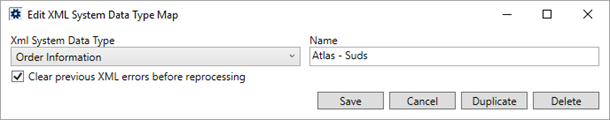 To support the Atlas SUDS Order Download processes, create a mapping for Atlas - Suds linked to the Xml System Data Type Map of Order Information.