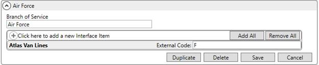 Link External Codes to military assigned codes. For example, map an External Code of 1 for the Atlas Van Lines to the military Code 1, map External Code of 2 to a Code 2, etc.