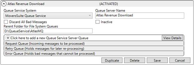 Establish a queue service for the Atlas Revenue Download within Queue Service Server Setup. This record defines the process and the folders referenced for XML files. Provide the specified options to enable the Atlas queue service.