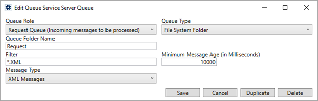 Provide the sub-directory for initial message files downloaded to your system. This sub-directory lists beneath what is specified for the Parent Folder for File System Queues. For example, if you set this to Request and the parent folder is D:\QueueService\AtlasMQ, then the application puts the request files within the D:\QueueService\AtlasMQ\request directory. |