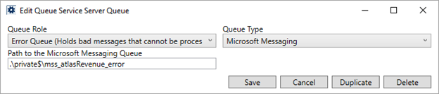 Provide the path to the directory for message files that cannot be reprocessed, e.g. .\private$\mss_atlasRevenue_error. This is generally a private folder within the Microsoft Queuing System folder structure. |