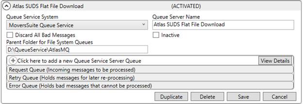 Establish a queue service for the Atlas SUDS Flat File Download within Queue Service Server Setup. This record defines the process and the folders referenced for XML files. Provide the specified options to enable the Atlas queue service.