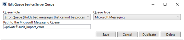 Provide the path to the directory for message files that cannot be reprocessed, e.g. .\private$\suds_import_error. This is generally a private folder within the Microsoft Queuing System folder structure. |