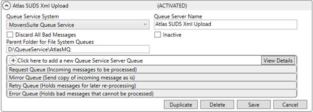 Establish a queue service for the Atlas SUDS Xml Upload within Queue Service Server Setup. This record defines the process and the folders referenced for XML files. Provide the specified options to enable the Atlas queue service.