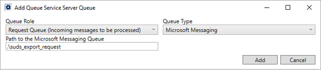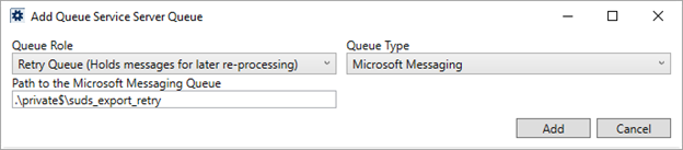 Provide the path to the directory for message files to be reprocessed, e.g. .\private$\suds_export_retry. This is generally a private folder within the Microsoft Queuing System folder structure.
