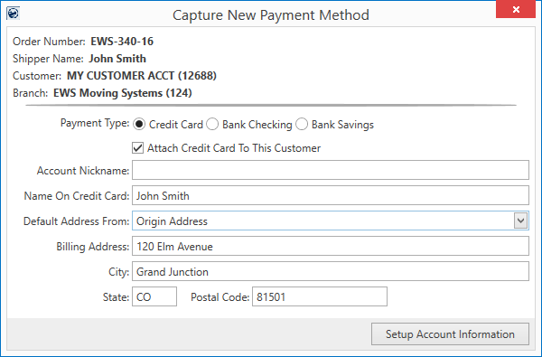 Setup Account Information Press this button to continue to add the payment information to the order through the Secure Payment Form, which connects MoversSuite to the merchant service provider. |