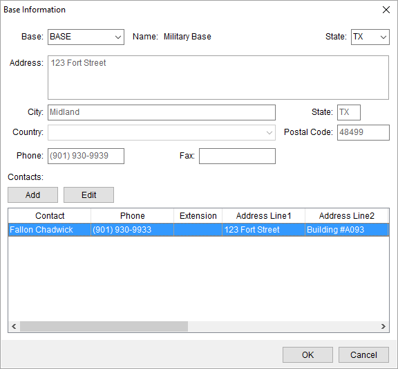 Options available to you through this screen include the ability to view, add, and edit contacts for the base. Press Add or Edit to create or update a new contact through the Add Contact dialog.