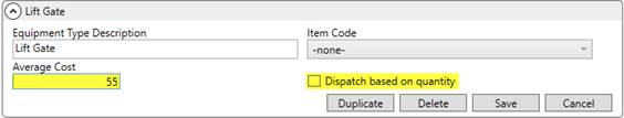 If the Dispatch based on quantity flag is set, then costing amounts compute based on quantity. Otherwise, if this flag is not checked, then costing is based on an hourly rate. In the example above (Figure 13), a three-hour service for the Lift Gate would cost the company $165.