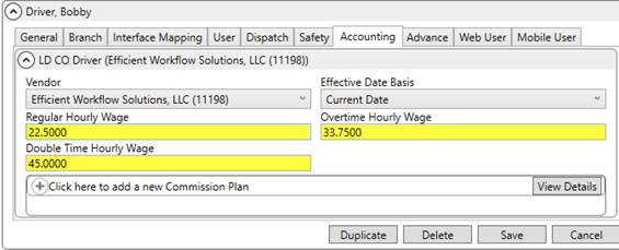 If you wish for a more granular labor expense, then you can assign actual wage values for each of your local crew and drivers you want included in Job Costing. Set the Regular Hourly Wage, Overtime Hourly Wage, and Double Time Hourly Wage within the Accounting tab for the appropriate Labor Type on each employee Personnel Setup record that you want included.