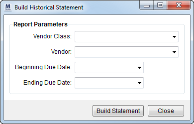 The Build Historical Statement screen allows a user to build a report listing all saved commission statement documents for a particular class and vendor for a given date range. This screen is available through the Commission Statement Management screen.