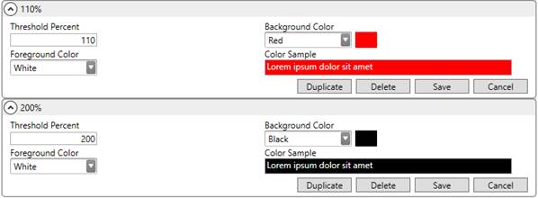 The Threshold Percent can go to any high limit you want. For example, if you wish to show over-capacity values in different colors, you can continue to go above 100%. Let us say you wish to show red for up to 10% over capacity and black for anything over that. Then you can setup something like the following: