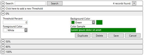 Enter the percentage as the starting point of the threshold (0 to unlimited). The threshold extends from the percentage enter here to the record with the next highest threshold percentage. |