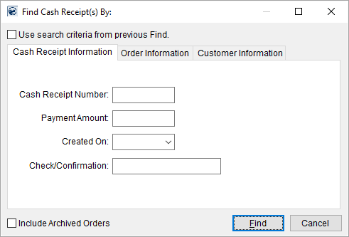 This section describes the Cash Receipt Information search criteria available to the Find within Cash Receipts.