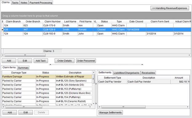 Use this tab to document the specific items of the claim along with managing settlements, liabilities/chargebacks, and receivables. | |