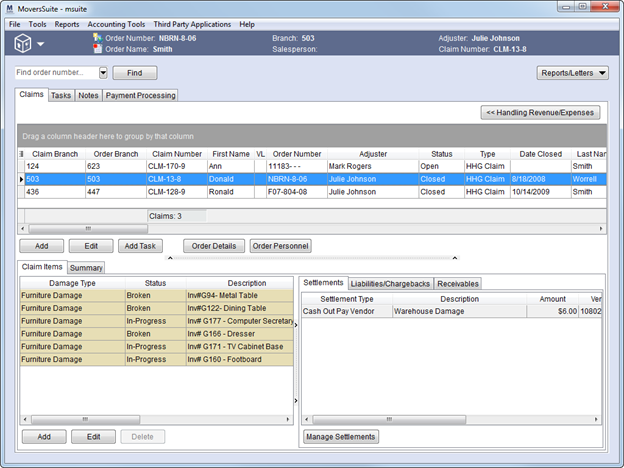 The Claims System provides a company a tool for entering and tracking a claim against an order and managing claim settlement. The module provides users the ability to manage payments, generate invoices, and create forms and letters, etc. for one screen.