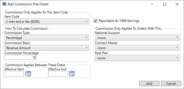 Add plan details within the Commission Plan Detail section. These are the specific records evaluated to determine the basic commission amount for an Item Code. Add and edit these records through the Add Commission Plan Detail dialog.