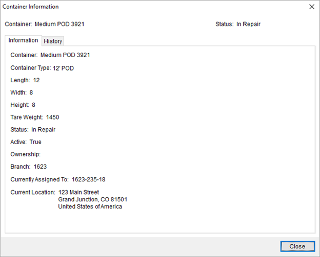 The Container Information and Container History options both open the same Container Information dialog, they each reference a different tab within Container Information. This read-only information provides additional details not listed in the data grid.