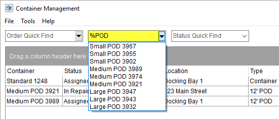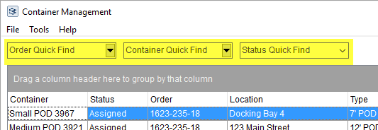 Quick search options include the ability to view all containers assigned to an order, to filter by name of the container, or to filter by status. You can enter text to search for and after three characters, the application automatically produces a menu of matches. Choose the list of matches using your mouse or by using the arrow keys and pressing Enter.