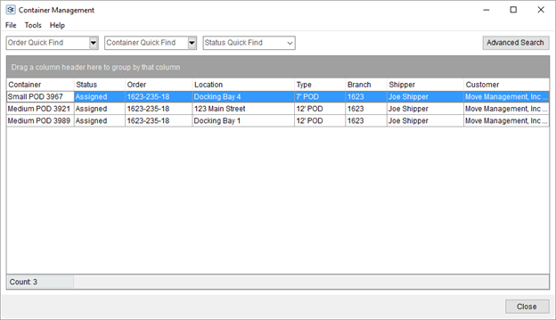 The three following Quick Find settings allow you to populate the data grid with container information based on the order assignment, the container number, or container status. Only containers and orders to which you have branch access display. So, if you only have access to Branch AAA, then only order or containers that link to Branch AAA display. | |