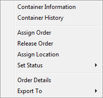 Release Order Removes the order assignment for the selected container. When this option is selected, a confirmation dialog appears asking you to confirm the request. This option is only available on a single container, i.e. you cannot select a range of containers and choose this option.