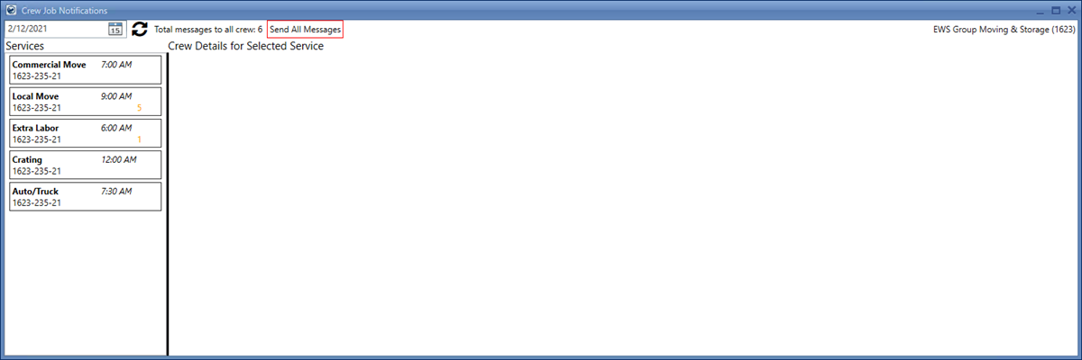 To start using the feature, you need to have at least one service with at least one crew member assigned to it. By clicking the Crew Notifications button, the main reference screen of the feature opens up. The screen loads the service details in the Crew Details for Selected Service table for the branch chosen and all the services listed in the Dispatching Common View.