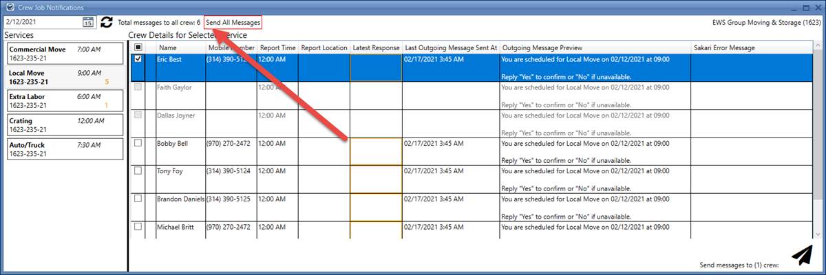 •For sending messages individually, you can checkmark the crew names from the Crew Details for Selected Service table and then press send.