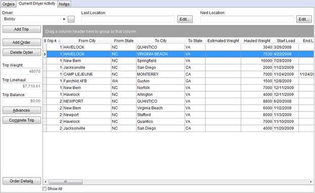 Selecting a driver populates the data grid and fills-in data on trip weight, linehaul amount, etc. You can set location, advances, mark trips complete and more through functions available on this screen and through right-click options (refer to Right-Click Options (Long Distance Dispatch) for information on available grid options).