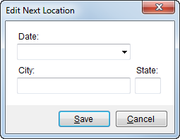 Set and manage the next anticipated location for this particular driver through this field. Press Edit to access the following dialog allowing you to set the Date, City (up to 26 characters), and State (two characters).