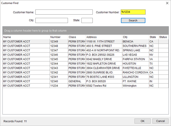 Additionally, you can instruct the application to search for a value anywhere in a field by using the percent wildcard (%). Say you wish to locate all customer records contain “1234” somewhere in the Customer Number. In this case, enter “%1234” for the Customer Number and press Search.