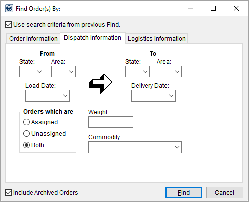Described in the following table are the fields available within the Dispatch Information tab of a Find. Refer to Find the topic for information on the functions available through this dialog.