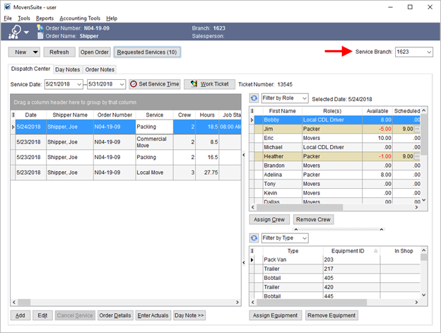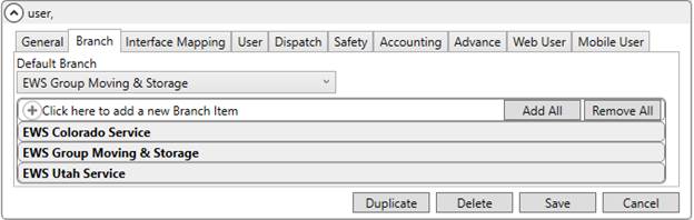 One restriction to the list of services, crew, and resources that you can access is branch assignment through your Personnel Setup record. You can only access data for branches that you are assigned. In the example below (Figure 28), this person can access the three EWS branches. If the common view also includes a fourth branch and you wish this employee to service this branch as well, then you would need to add that fourth branch within the Branch tab of their Personnel Setup record.