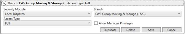 Additionally, if you wish this employee to access specific functionality for each of these branches as well, such as being able to make crew assignments within Local Dispatch, then the person also needs appropriate security access for each branch for the Local Dispatch module. This assignment occurs within Security Profile Setup (Figure 29). Refer to the Local Dispatch description within the Security Modules topic for more information.