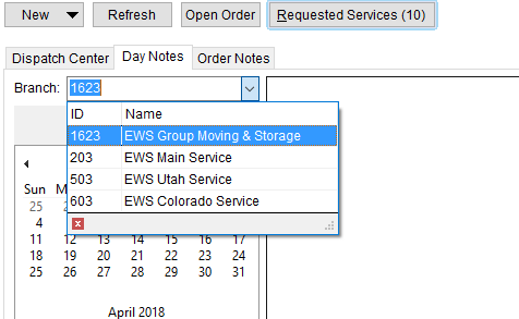 While working in Local Dispatch, you can see a list of common branches through the Day Notes tab. The Branch selector on this screen displays all common branches associated to the Service Branch. In the illustration below (Figure 31), branches 1623, 203, 503, and 603 are all part of the same common view.