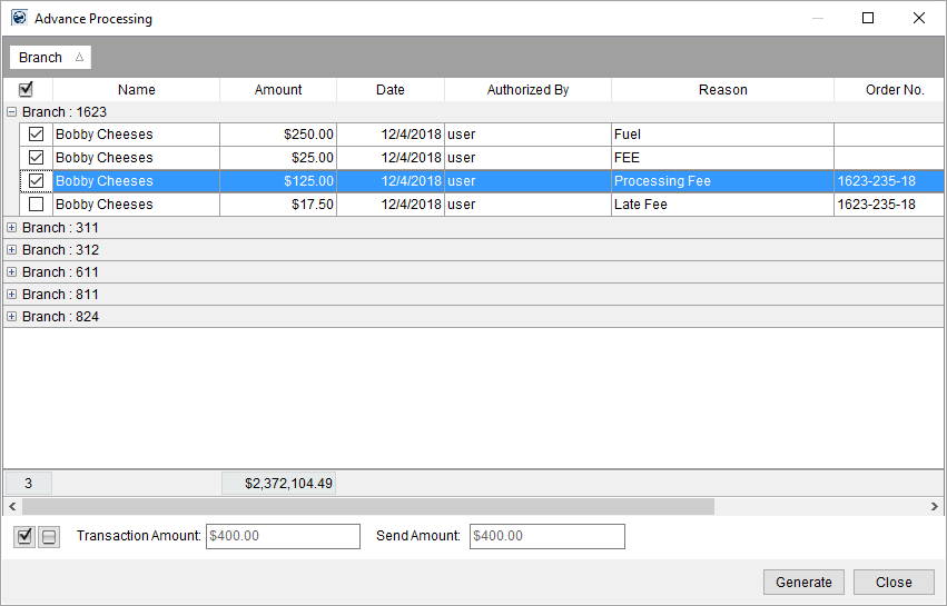 •If your company integrates with a third-party banking service provider, then additional processing can occur through the Advance Processing screen based on setup (Comdata Integration and T-Chek Advances Upload).