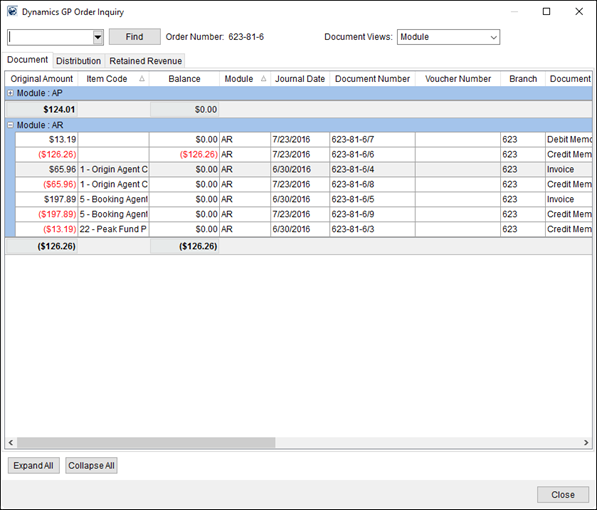Use the Dynamics GP Order Inquiry screen to display the actual posting information for a particular order. The application references data from Microsoft Dynamics GP and displays it within three categorized tabs, as described in the table below.