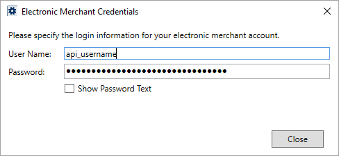Enter the User Name and Password as detailed in the table below. You must press Save from Electronic Merchant Setup to keep changes made through this dialog.