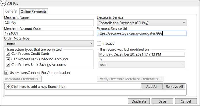 Select the appropriate service processor for your Electronic Payments. MoversSuite currently supports the following provider: Constellation Payments (CSI Pay)