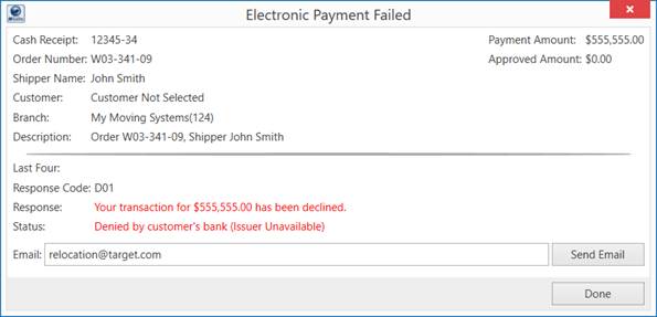 This screen appears after a failed payment attempt from data processed through the Secure Payment Form. The data presented in this screen allows you to view the reason behind the failure and send an email that includes the response from the merchant service provider.