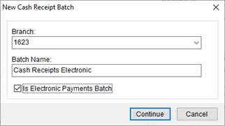 2. Specify a Branch and provide a name for the batch. Appending the name with “Electronic” and “Non-Electronic” helps you quickly identify the batch type.