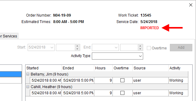 If the service has been imported into Revenue Entry through the Import Actuals function, then IMPORTED displays below the Service Date. |