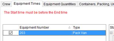 The Equipment Times tab, available through the Enter Actuals screen, allows you to set and update the times that a resource was allocated for the service for billing.