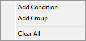 The options available at this level include the following: Add Condition This option inserts a new, top-level group to the bottom of the listing. Add Group This option inserts a group with “AND” operator and a new condition below it. Clear All Remove all groups and conditions within the screen with this option.