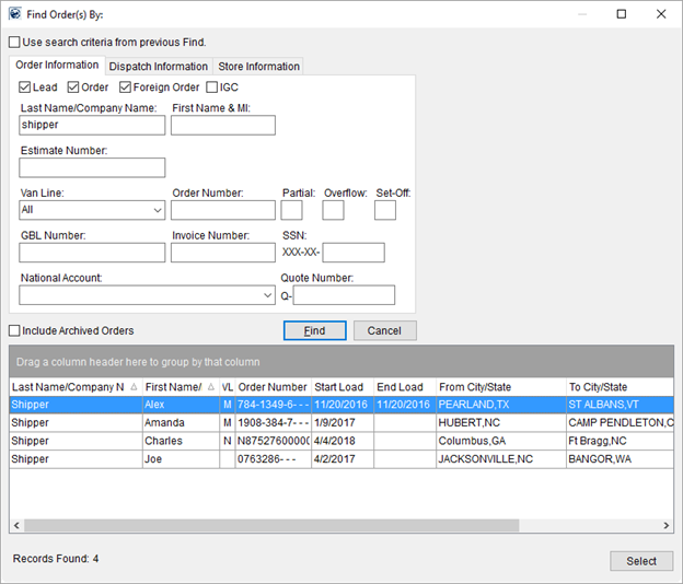 The Find screen automatically closes upon locating a single qualifying record or if the user is using Find within Long Distance Dispatch or Claims. In Long Distance Dispatch, the Find results display within the Orders tab.